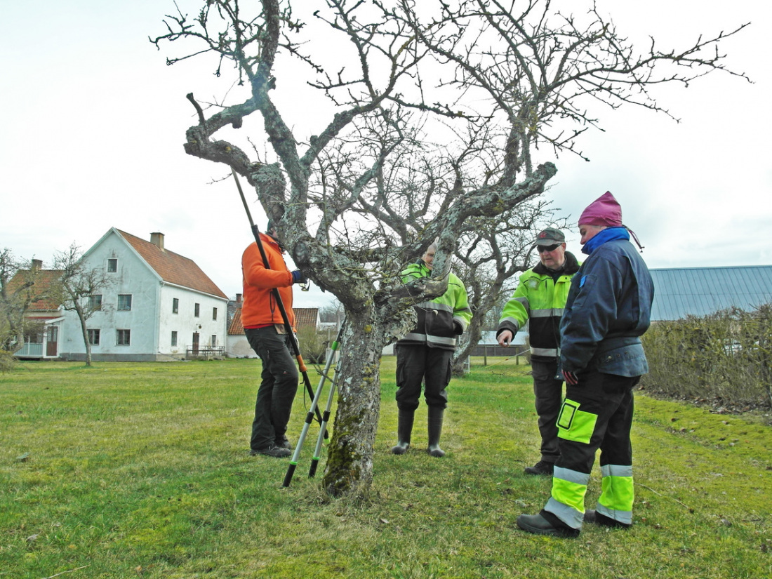 De äppelträd som finns kvar på Vanges är främst Stenkyrke. Karsten Farkas, Bo och Karin Hammar samt Brigitta Dahlkvist beskär för luftig krona.
